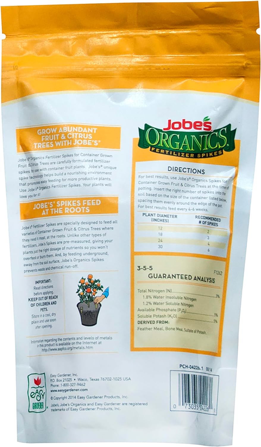Fertilize plants quickly and easily with Jobes Organic Fertilizer Spike. Specially formulated to provide the most efficient delivery system for organics, the easy to use spike provides plants with much needed nutrients leading to maximum growth potential. Ideal for use with a variety of fruit and citrus trees. Available in a convenient six pack re-sealable pouch.